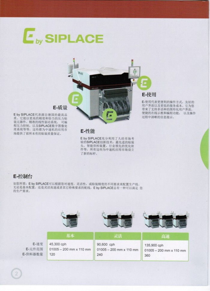 ASM E by SIPLACE 中速貼(tiē)片機代(dài)表源自德國的最高品(pǐn)質。它能以更(gèng)高的精度(dù)和(hé)恰(qià)當的壓力貼(tiē)裝(zhuāng)元器件。精準的(de)線性驅動係統,可編程壓(yā)力控製,以及(jí)SIPLACE數字圖像處(chù)理係統(tǒng)等等,這些都為中速機的應用市場提供(gòng)了前所未有的貼裝質量保證。