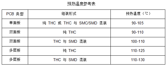 印製(zhì)板預(yù)熱(rè)溫度和時間要根據印製板的大小、厚度、元器件(jiàn)的大小和多少、以及貼裝元器件的多少(shǎo)來確定。預熱溫度在 90-130℃(PCB 表麵溫度),多層板以及有較多貼裝元器件時預熱溫度取上限,不同 PCB 類型和(hé)組裝形式的預熱溫度(dù)參考(kǎo)下表。