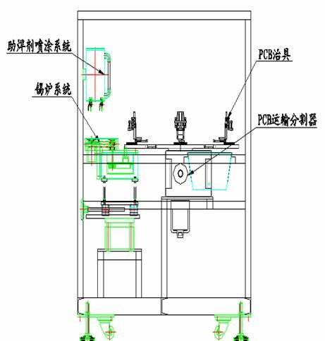 本方案設計為圓盤式自動化生產設計。其中焊(hàn)錫段采用異形噴口,一次多點焊接設計,確保產能(néng)。每2塊PCB板為一組。