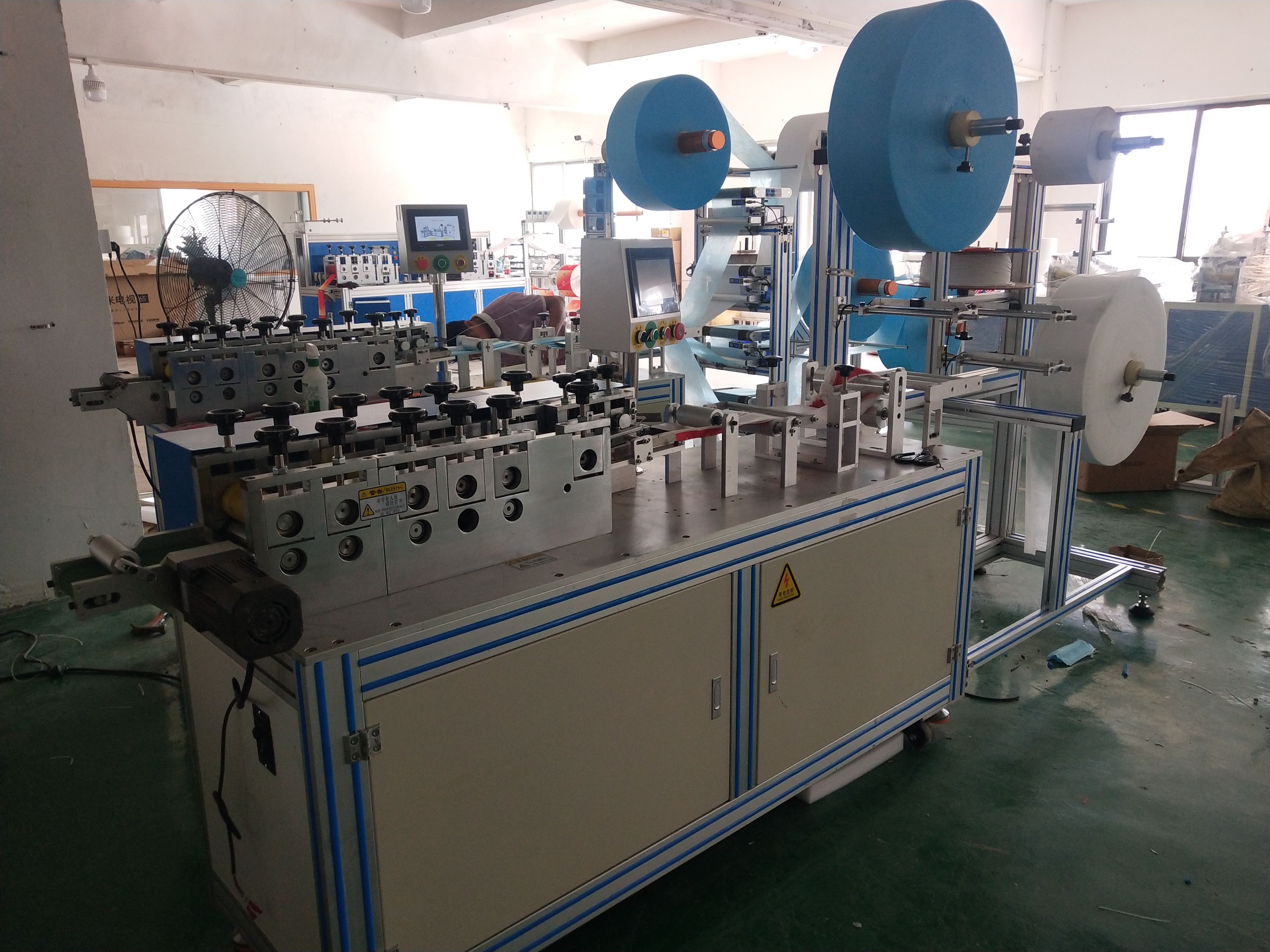 平麵口罩打片機采用PLC控製係統(tǒng),觸摸屏(píng)設置,操作簡單便捷,可(kě)單人單機使用,隻需要工人放料即可,可極大的節省人工,采用自動化生產,使用1~4層PP紡粘無紡布,整個機台(tái)從原(yuán)材(cái)料入料到鼻線插入(rù),封邊,裁切成品均為一條線自動化(huà)作業。該平麵口罩生產設(shè)備性能(néng)穩定,產量(liàng)高,不良(liáng)率低,易於操作。